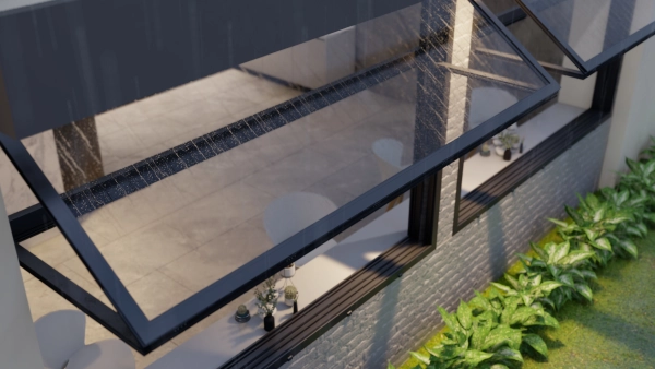 Cửa gấp trượt dọc tự động mang lại lợi ích kép cho người dùng khi vừa đảm bảo chức năng vách kính, vừa có thể gấp trượt lên trên theo phương dọc để chuyển đổi dễ dàng thành mái che. Khi mở, cánh dưới định vị ở vị trí vuông góc với phương đứng, cánh phía trên xếp tạo thành mái hiên nhỏ vừa mở ra tầm nhìn thoáng đãng, giúp tăng khả lấy sáng, lưu thông gió tự nhiên vừa có khả ăng che mưa. Khi đóng lại, những ô đố mang hơi thở cổ điển tạo nên phong cách châu Âu lãng mạn cho công trình.